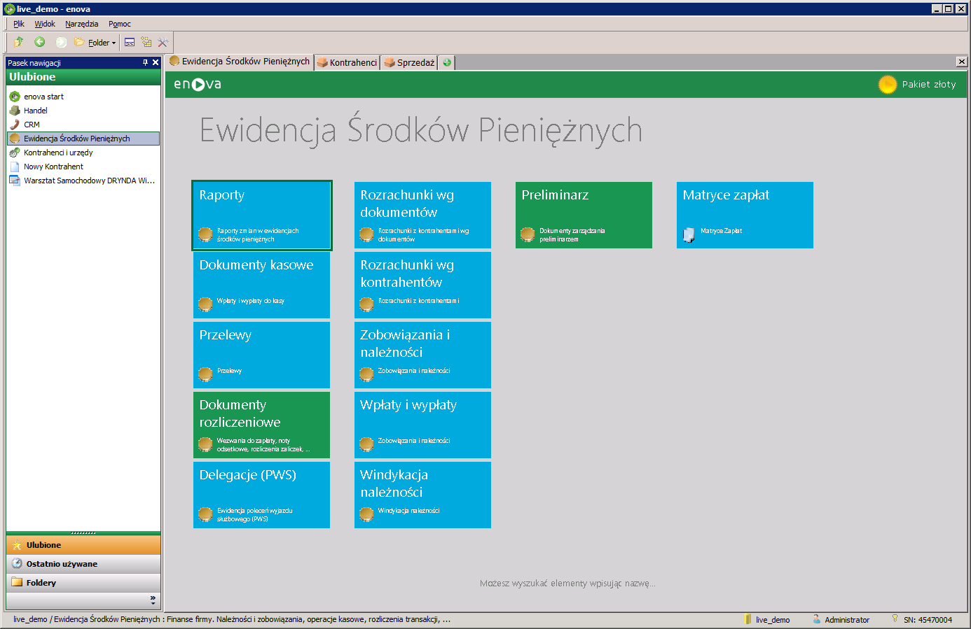 System enova został wyposażony w funkcjonalność, która odpowiada za ewidencjonowanie, tworzenie i raportowanie wszystkich operacji gospodarczych oraz dokumentów związanych z prowadzeniem rozrachunków, rozliczeń z kontrahentami, pracownikami, urzędami, bankami itp. Moduł Ewidencji Środków Pieniężnych wspiera przede wszystkim pracę osób odpowiedzialnych za przygotowywanie raportów kasowych, ewidencjonowanie wyciągów bankowych, prowadzenie rozliczeń z kontrahentami oraz windykację należności w firmie.